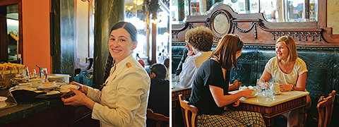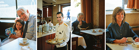 左から:孫娘を連れてコーヒーを飲みに来店した地元の紳士。/ホール・スタッフの出で立ちも伝統を守る。/昼間は比較的観光客も少なく、落ち着いた雰囲気。