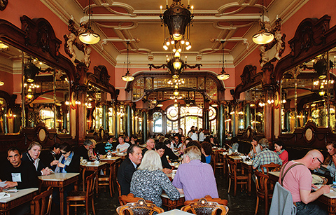ハイブランドのブティックが軒を並べるポルト随一のプロムナード、サンタ・カタリーナ通りで一際目を引く建物がマジェスティック・カフェだ。1923年創業。優美な曲線を多用した装飾的なデザインは、当時のヨーロッパで大流行したアール・ヌーボーの影響が色濃い。黒服にボウタイ姿のドアマンに導かれて、ひとたび店内に踏み入ると、そこは何もかもが古めかしく厳かで、まるでファンタジーの世界。