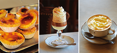 左:玉子たっぷりのタルト、ナタ(2ユーロ)。/中央:スペイン・ヴァレンシアで人気に火がついたボンボン・コーヒー(5ユーロ)。まるで、”飲むケーキ”。/右:ホイップクリーム入りコーヒー(4ユーロ)。