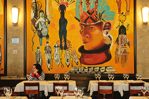 店内の壁一面を覆う、先住民の文化をモチーフにしたグラサ・モライス女史の作品〈ブラジリアの紳士淑女〉。