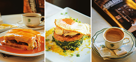 左:フランセジーニャはステーキ、ハム、ソーセージ、チーズをパンで挟んだ、ボリューム満点の郷土料理(12.80ユーロ)。/中央:ラスカス・デ・バカリャウはポルトガル伝統の干し鱈料理(13.80ユーロ)。これでもポルトでは「軽食」の部類だとか。/右:カフェラテ(1.40ユーロ)。
