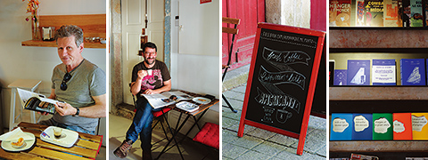 左から:午後のコーヒーブレイクに訪れた常連客。/旅行中に店の評判を知ってやってきたブラジル人。/歩道に立てられた店の看板。お隣はアンティーク・ショップ。/この店の唯一のセールスポイントと言えそうなマガジンラックにはアート系のZINE(個人が発行する簡易出版物)も。