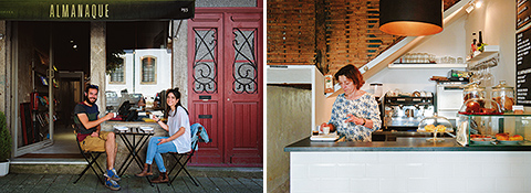 左:歩道に据えられたテーブルにいたのはスペイン人のカップル。店の外観が気になって入店した。/右:グラシンダさんはポルトから少し内陸に入ったペニャフィエルという町の出身。コーヒー豆はブラジルとアンゴラのものを使っている。