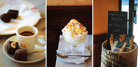 「ニューヨークにあるような店にしたかったの」とマネジャーのパウラ・モンテイロさん。古い映画館のあるビルの1階部分にあって、映画帰りの客も多い。ベルギー産のショコラが並ぶショーケースの背後には、ジャマイカのブルーマウンテンを筆頭に、キューバ、コロンビア、エチオピア、ブラジルなど10カ国のコーヒー豆が量り売り用のサーバーに入れられて並ぶ。メニューには15種類ものエスプレッソ・ドリンクが。「エスプレッソ・グルメ」は豆を7カ国からチョイスできる。ケーキ、ジェラート、フラッペ(かき氷)……ニューヨークっぽいかどうかは別として、極めて豊かなメニューである。