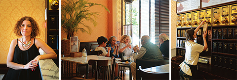 左:マネジャーのパウラさん。/中央:映画帰りのカップル、友だち同士、家族連れなど、あらゆるタイプの客が来店。シーズンには観光客が8割を占めることもある。/右:量り売りのコーヒー豆を袋に詰めるスタッフ。中南米諸国を中心にアフリカ、東南アジアの豆も。