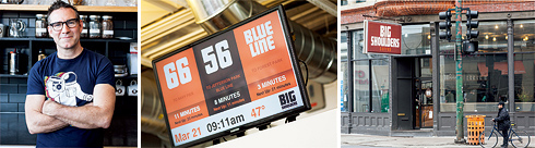 左:オーナーのティム・クーナン氏は俳優の故ロビン・ウィリアムズを彷彿とさせる風貌。/中央:店の下を走るブルーラインの運行状況を告げるモニター。/右:この物件をクーナン氏が見つけたのは向かい側の店で朝食を取っていたときのこと。交差点の角で駅の近くというのが気に入った。