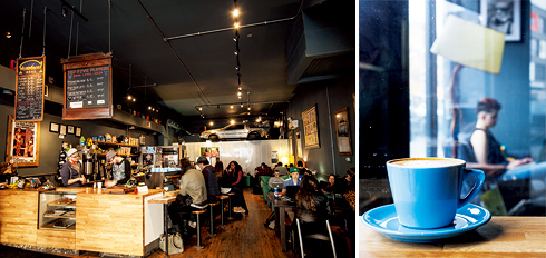 左から:大きな窓と白い壁を基調にしたシンプルで明るい内装。/窓際のカウンター席は話の尽きない友達同士に。/ケニアやエルサルバドルの豆はケメックスで抽出。それぞれの豆の持ち味を最もよく引き出す抽出方法をセレクト。/洋梨のジャムが入ったペアバターロール(3.75ドル)とカプチーノ(3ドル)。
