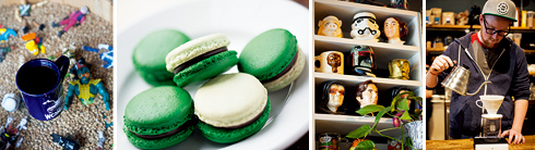 左から:フィギュアを並べた特製テーブルとオリジナルマグ(10ドル)。/マカロン(1個1.50ドル)の色合いもSFっぽい。/マグ・コレクションの棚には、E.T.やマイケル・ジャクソンの顔も見える。/ハンドドリップでシングルオリジンの抽出。