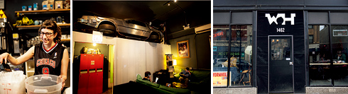 左:シカゴ・ブルズのジャージーを着たスタッフ。スタッフも80年代の映画に出てきそうな個性派が揃っている。/中央:デロリアンはオーナー自らが中古車から作り上げたもの。/右:”異空間”への入り口。カフェには見えない?