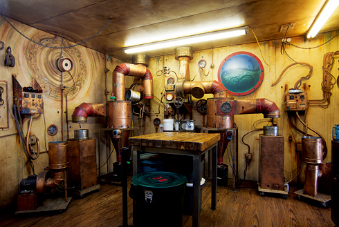 店全体がジェイソン・ブラマーというアーティストのインスタレーション。金色と朱色に塗られ、配管がデフォルメされたロースターはファンタジーの中のゴシックな宇宙船のようだ。