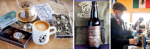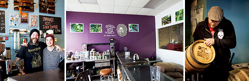 左:個性派揃いのスタッフ。タトゥー・カルチャーとコーヒー・カルチャーの結びつきが強いのもシカゴの特徴。/中央:ヘッドクォーターでは日々カッピングが繰り返されている。/右:樽でコーヒー豆を寝かせる熟成コーヒーを研究中で、コニャック樽、リキュール樽など85種類の樽を試している。