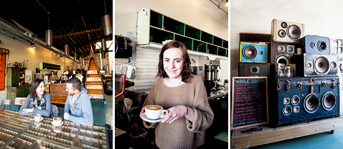 メインのテーブルは活字の整理棚をリフォームしたもの。エスプレッソ3ドル、カプチーノは3.50ドル。/レイクビューにある1号店のスタッフ。/壁際にうずたかく積まれたスピーカー。ボードには売っている豆のリストが。常時10種類以上の豆が揃う(12オンス入り、12.50〜23ドル)。