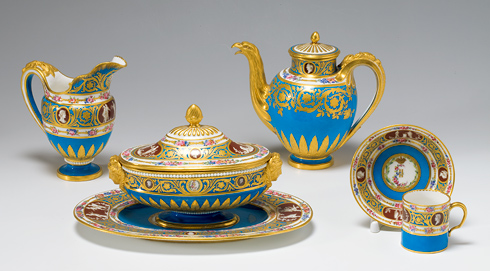目の覚めるようなブルーと金彩が眩しい輝きを放つコーヒーポットとカップ&ソーサー、そしてクリーム容れ、砂糖容れ。「カメオ・セルヴィス」と名付けられたこのセットは、ロシアのエルミタージュ美術館の所蔵品である。