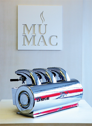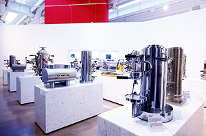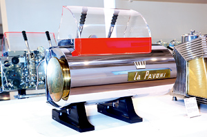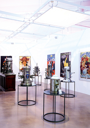 40年代のコーナーには、イノックス素材の美しいマシーンが勢ぞろい。この頃、マシーンの燃料はまだガスだった。カップの保温スペースが必要となり、縦型から横型にデザインが変わってきた。