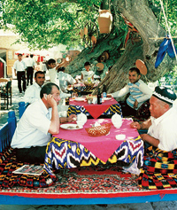 中央アジアのウズベキスタン。かつてのシルクロードのオアシス都市、古都ブハラでバスから降ろされたのは、深夜の幹線道路脇。宿まではタクシーしかない。隣国キルギスで脅され、高い料金を払わされた記憶がよみがえる。ビビりながら乗ると、ここの運転手は親切だった。ブハラでは土色の建物ばかり目立ち、5月なのに暑い。街の中心にラビハウズという池があり、周囲に多くの中央アジア風喫茶店。男たちがのんびり胡坐をかき、遠いシルクロード華やかなりし頃を思い起こさせる。人を魅了する伝統的な店。私もこれを見るためにやってきたのだ。