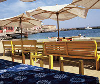 地中海に沿って長く並ぶ椅子。新たな客がベイルート・カフェから道路を渡って持ってきた。