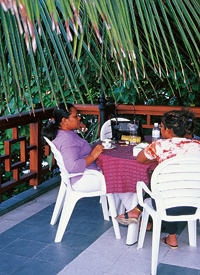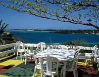 首都マーレ。港町のホテルの屋上にオープンカフェ。青い海を進む白い小型船が目に入る。