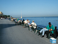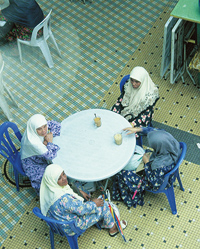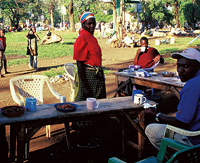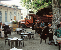 池の周りには多くの伝統的喫茶店が。木陰のテーブルでチェスを楽しむ男たち。とくに雰囲気のいいのは縁台を使った店だ。ひときわ目立つテーブルクロスは、伝統的な矢がすり模様。