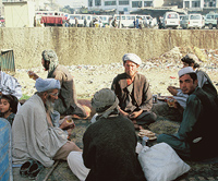 熱気のあるカブールの市場。地面に敷物を広げた店はアフガン的オープンカフェか。