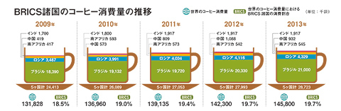 A BRICS(ブラジル、ロシア、インド、中国、南アフリカ)の市場はとても大きいですね。昔は生産する一方だった国々も消費量が急激に伸びています。とくに中国は年々増加していて、北京では若い人がカフェに行くのがステイタスになっているようです。
