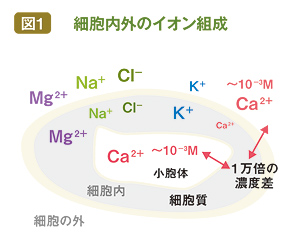細胞の内外のイオン組成を表す図1を見てほしい。カルシウムの濃度は細胞の外側および細胞内小器官の1つである小胞体の方が圧倒的に細胞質より高い。その濃度差はおよそ1万倍だ。