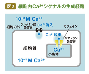 細胞内のカルシウム濃度を高めるためには、「細胞の外側からカルシウムを流入させる」「小胞体が蓄えているカルシウムを細胞質に放出する」という2通りの方法があるが、後者にはカルシウムを放出する「リアノジン受容体」がかかわっている。図2はそれを図式化したものだが、カフェインにはリアノジン受容体を活性化させる働きがある。山澤さんはここでまたカフェインに興味をもつ。