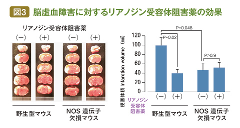 最初の実験は、マウスの片側の頚動脈に細いステンレスを入れて血流を止めて、40分後に取り除いて血液を再還流させるもの。このとき、リアノジン受容体の働きを阻害する薬を投与した結果、投与しない場合に比べて脳梗塞の領域が少なくなることがわかった。次にNOをつくる酵素の遺伝子をなくしたマウス(NOS遺伝子欠損マウス)を使うと、NOがつくられないので脳梗塞の領域は減少した。つまりこの減った分だけNICRが関与していることになる。NOS遺伝子欠損マウスでは、リアノジン受容体阻害薬を投与してもさらなる減少は認められなかった。(図3)