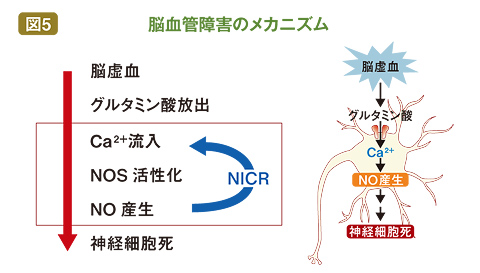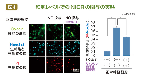 NICRは細胞質のカルシウム濃度の上昇からNO産生までのサイクルを増幅させ、神経細胞死を誘発しているのではないかと考えた。(図5)