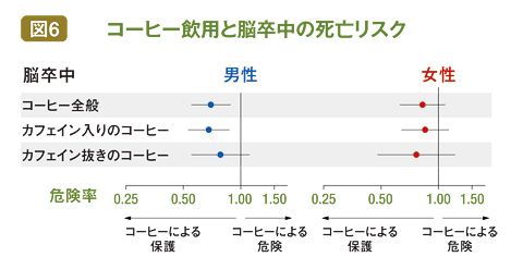 これは、アメリカの研究グループが糖尿病やがんなどいろいろな病気に対してコーヒーの飲用の有無を絡めて調べた大規模な疫学調査だ。そこには「コーヒーを習慣的に飲むことで脳卒中の死亡リスクは低下する」と報告されている。(図6)