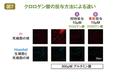 その結果が図7だ。まずは神経細胞にグルタミン酸とクロロゲン酸を同時に投与すると、死細胞(赤色)が少し減った。そこで今度はクロロゲン酸を投与したあとにグルタミン酸を投与するという「時間差」の実験を行なった。すると今度は死んだ細胞の数がはっきり減った。