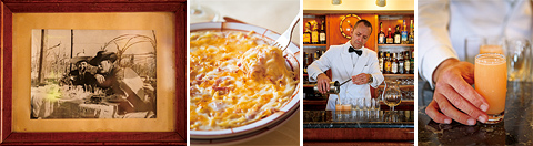 (左から)トルチェッロ島のオーベルジュの壁に飾られた写真。ジュゼッペ・チプリアーニ(左)とヘミングウェイ。/タリオリーニ・グラタンはこの店の名物料理。/ハリーズ・バーのカウンター。ヘミングウェイもここでバーマンの所作に見入っただろうか。/ピーチ・ジュースとプロセッコで作るベリーニ。
