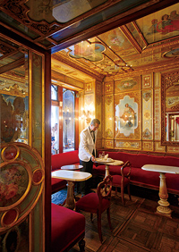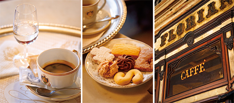 (左から)カフェ・コン・グラッパ。/クラシックな意匠と味わいを持つビスコット。/サン・マルコ広場のコリドーに面したカフェ・フローリアンの入口。スタンダールもジョルジュ・サンドもグレース・ケリーもこの店でコーヒーを楽しんだ。