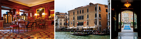 (左から)1525年に総督の住まいとして建てられたホテル・グリッティ・パレスのラウンジ。/運河に面した入口。/ヘミングウェイの定宿で、『河を渡って木立の中へ』の主要舞台の1つにもなっている。