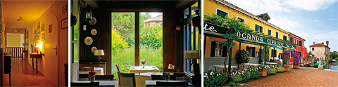 (左から)2階の中ほどに位置する客室にヘミングウェイは泊まった。客室は6室のみ。極めて家庭的な宿だ。/ロカンダ・チプリアーニのダイニング。窓の外には、美しい庭園と12世紀に建てられたサンタ・フォスカ教会が見える。/ロカンダの正面。ヴェニス本島からランチに訪れる人も多い。