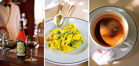 (左から)ヴェネト州を代表する銘酒アマローネ。文豪は夜、部屋に帰るときにこのワインを6本携えていき、朝にはすべてを空にしたとか。/小エビとグリーンピースのパッパルデッレ。料理に使われる野菜の多くは敷地内の菜園から。/テラス席でランチの後に出されたたっぷりのコーヒー。