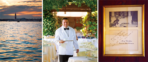 (左から)ヘミングウェイが足繁くヴェニスに通ったのは彼自身の「落日」に差し掛かる時期だった。/木漏れ日と涼風が気持ちいいテラス席。ヘミングウェイは冬場でも屋外で食事することを好んだ。/額装されたクリスマス・メッセージと写真。文豪と黒猫、メアリー夫人が写っている。