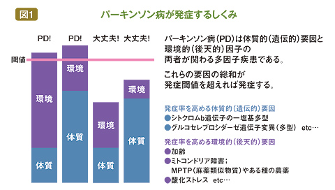 体質的要因だけで発症する人もいるがきわめて少数であり、通常は人それぞれの体質に環境的因子がどれくらい加わったか、その総和でパーキンソン病の発症の有無が分かれる(図1)。
