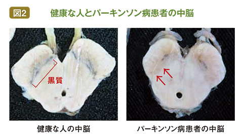 図2を見てほしい。これは中脳の写真だ。健康な人の中脳の黒質にはメラニン色素を含むドーパミン神経が密集している(左)。しかし、パーキンソン病患者はドーパミン神経が変性して(死んで)脱落するため、黒質の黒い部分が健康な人に比べると明らかに少ないのがわかるだろう(右)。