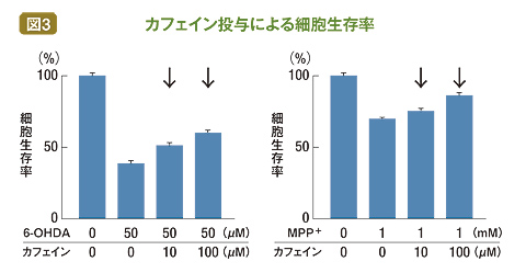 その方法は、細胞に毒性物質を加えて細胞死を引き起こし、そこに濃度の異なるカフェインを投与するもの。毒性物質はパーキンソン病の実験でポピュラーな「MPP+(MPTPの代謝産物)」「6-OHDA(酸化したドーパミンのような物質)」「ロテノン(ミトコンドリアに負荷をかける農薬の一種)」を用いた。