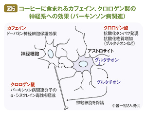 これらの実験から、カフェインにはドーパミン神経細胞を保護する効果が、クロロゲン酸にはパーキンソン病に関連する分子のα‐シヌクレイン毒性を軽減する効果が、それぞれあることがわかった(図5)。しかし、コーヒーそのものの効果は調べきれていないと中曽さんは明かす。