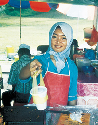 イスラム教徒の女性の撮影は難しいものだが、頼むと快くOKしてくれた。ここは首都。ブルネイ川には旅情を誘う世界一の水上都市がある。橋のような木の長い道を自転車がコトコトと走っていく。