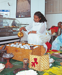 首都の空港には華やかな伝統的カフェがある。コーヒー発祥の地ともいわれる同国には日本の茶道に似たコーヒー道なるものがあるが、それを行うエチオピア式コーヒー道具が揃っている。いれる女性も民族衣装だ。