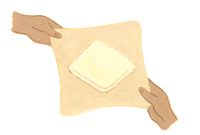 [2] [1]の水、小麦粉2種、溶かしバターをボウルに入れ、ポロポロの塊になるよう、練らずに混ぜる。よく混ざったら、生地を一つの塊にまとめ、中央に十字の切り込みを入れる。作業台に軽く打ち粉をし、十字の切り込みから生地を広げて麺棒で1cmほどの厚さの正方形に伸ばす。ラップで包み、冷蔵庫で2時間ほど冷やす。