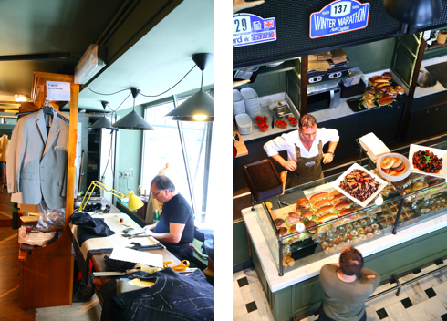 (左)2階のスーツ仕立て工房。スーツカルチャーの中心、ミラノが誇る職人技を見ることができる。