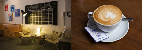 (左)オフィス入口には今週のイベント情報が (右)カプチーノは2,10ユーロと市内の平均より少々安め