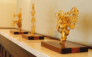 コロンビアの伝統工芸品が並ぶ一角。手前はエル・ドラード(黄金郷)伝説を生み出したムイスカ人の置物。