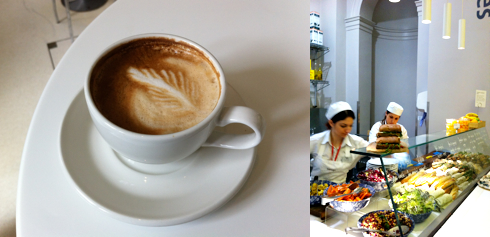 (左)フラットホワイト、2.90ポンド。マグカップでの注文もでき、価格は同じ (右)サンドイッチはサラダ付きで7.25ポンド前後。毎朝、館内で作るため新鮮