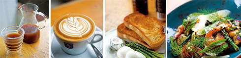 左から順に:新メニューの〝コーヒー・ショット〟(6豪州ドル)/〝マジック〟はコーヒーの風味を強調してヒット(4豪州ドル)/ポーチドエッグとアスパラ(12豪州ドル)/サーモンのニョッキ(22豪州ドル)