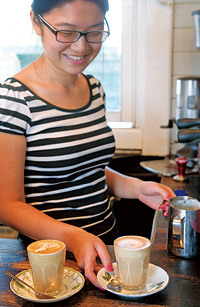 右:”マジック”(フラット・ホワイトのコーヒーを倍量にしたもの)を運ぶスタッフ。8年前に考案されたヒット作だ。