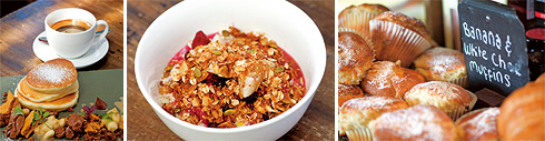 中央:グラノーラと季節のフルーツをトッピングした”名物”ビルヒャー・ミューズリー(11.9豪州ドル)。